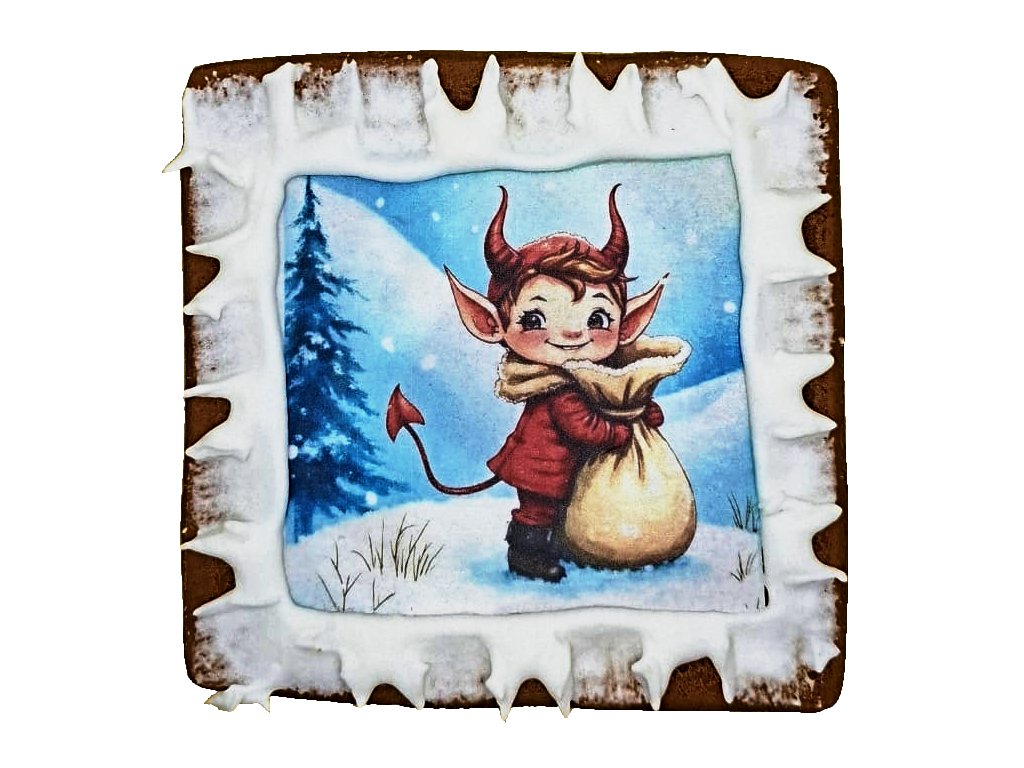 Jemný medový perník s motivem Čerta na jedlém papíru.
