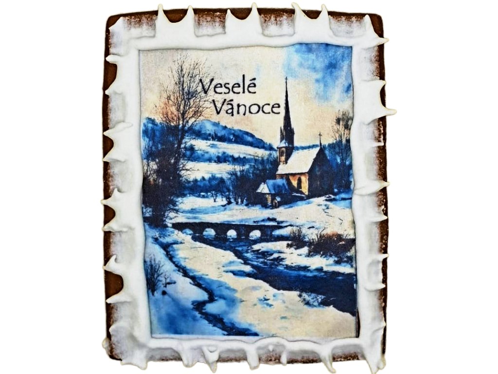 Jemný medový perník s motivem vánoční krajiny na jedlém papíru.