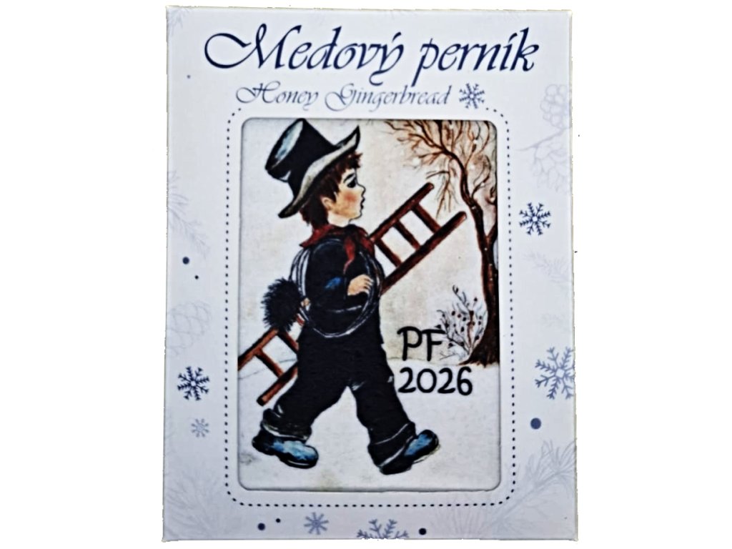 Jemný medový perník v dárkové krabičce s motivem kominíka na jedlém papíru.