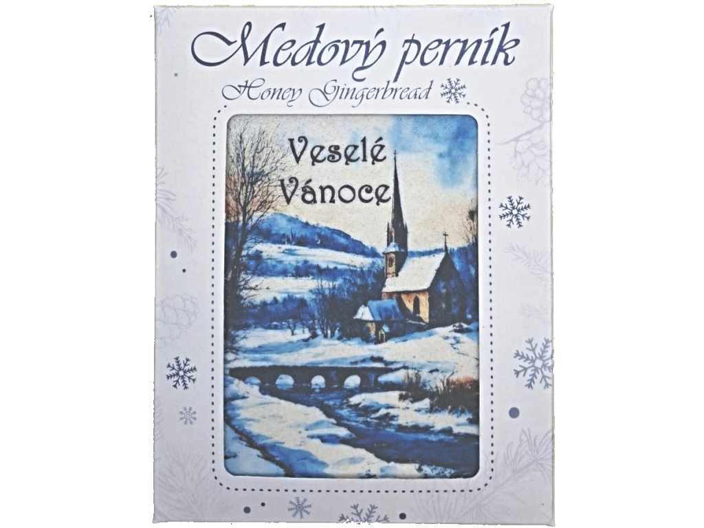 Jemný medový perník v dárkové krabičce s motivem zimní krajiny na jedlém papíru.